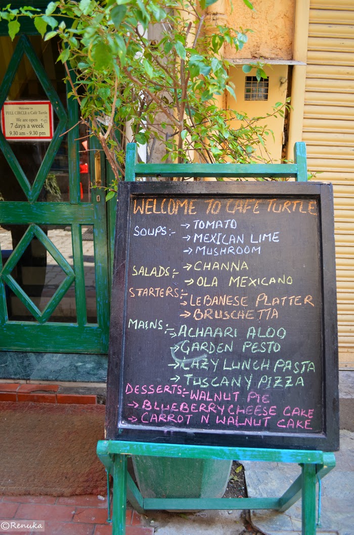 Turtle Cafe and bookstore at Khan Market in Delhi – This is the menu for the day. The cafe has a lot of character and colour. Even the outside looks colourful.